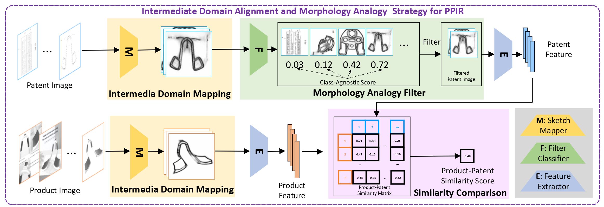 Recent advances in artificial intelligence have significantly impacted image retrieval tasks, yet Patent-Product Image Retrieval (PPIR) has received limited attention. PPIR, which retrieves patent images based on product images to identify potential infringements, presents unique challenges: (1) both product and patent images often contain numerous categories of artificial objects, but models pre-trained on standard datasets exhibit limited discriminative power to recognize some of those unseen objects; and (2) the significant domain gap between binary patent line drawings and colorful RGB product images further complicates similarity comparisons for product-patent pairs. To address these challenges, we formulate it as an open-set image retrieval task and introduce a comprehensive Patent-Product Image Retrieval Dataset (PPIRD) including a test set with 439 product-patent pairs, a retrieval pool of 727,921 patents, and an unlabeled pre-training set of 3,799,695 images. We further propose a novel Intermediate Domain Alignment and Morphology Analogy (IDAMA) strategy. IDAMA maps both image types to an intermediate sketch domain using edge detection to minimize the domain discrepancy, and employs a Morphology Analogy Filter to select discriminative patent images based on visual features via analogical reasoning. Extensive experiments on PPIRD demonstrate that IDAMA significantly outperforms baseline methods (+7.58 mAR) and offers valuable insights into domain mapping and representation learning for PPIR.